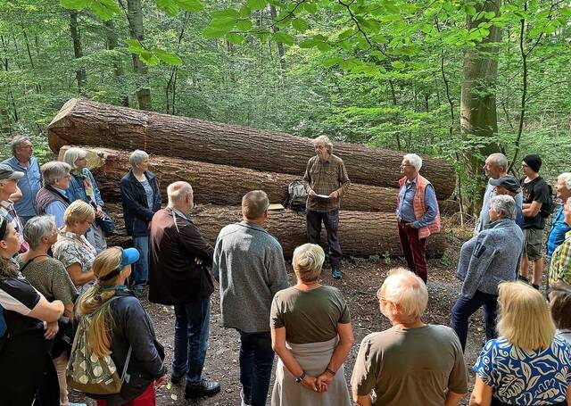 Wie nachhaltige Waldbewirtschaftung aussieht, hat Tybussek nun bei einem Waldspaziergang des Gemeinnützigen Bürgervereins Bad Schwartau erklärt. Gemeinsam mit Michael Thole vom Bürgerverein führte Tybussek rund 40 Interessierte durch den Riesebusch. Im Fokus der Begehung: Bereiche, in denen im Winter Holzeinschlag vorgenommen wurde. Knapp 540 Festmeter Holz wurde geerntet. Dabei sind viele starke Bäume laut Tybussek entnommen worden – unter anderem 50 Meter hohe und rund 130 Jahre alte Douglasien. „Holz von bester Qualität, das bis zu 280 Euro pro Festmeter gebracht hat“, berichtet der Revierförster, der insgesamt um die 120 Bäume hat fällen lassen. Was sich viel anhört, ist aber auf die gesamte Waldfläche von 27 Hektar eher gering – etwa fünf Bäume pro Hektar.