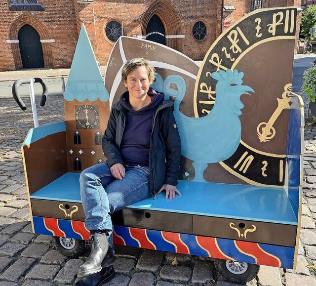 Die Bank ist nicht fest verankert, sondern lässt sich bewegen. Dank stabiler Reifen kann Pastorin Reichelt sie über das Kopfsteinpflaster ziehen und immer wieder neu aufstellen.