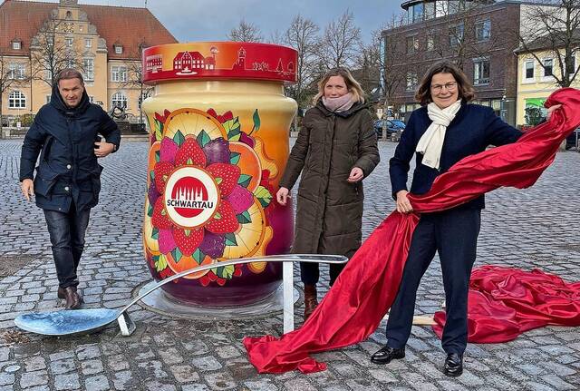 Unterstützung gab es dabei von der Geschäftsführung der Schwartauer Werke – Markus Kohrs-Lichte, Jonas Forsell und Thomas Sauermann sowie Personalleiter Florian Brombach. Das Traditionsunternehmen hat die Geschenke eigens entwerfen lassen, angeschafft und nun der Stadt vermacht. Es ist aber kein vorgezogenes Weihnachtsgeschenk, sondern ein verspätetes Präsent zum125-jährigen Unternehmensjubiläum, das im vorigen Jahr groß in und mit der Stadt gefeiert wurde. Mit dem Kunstwerk wollen die Schwartauer Werke ihre tiefe Verbundenheit mit der Stadt zum Ausdruck bringen.„Wir leben zwar Tür an Tür mit den Bürgern, und die Firma hat ihren Sitz in unmittelbarer Nähe zum Stadtzentrum. Doch so richtig werden die Schwartauer Werke nicht wahrgenommen“, sagte Geschäftsführer Markus Kohrs-Lichte bei der Enthüllung. Mit dem XXL-Marmeladenglas soll das nun anders werden. Das Objekt mit dem Namen „Marmeladenstadt“ lädt nämlich als Fotopoint zu Selfies ein – das erste machte Kohrs-Lichte gleich selbst mit Stadtpräsidentin und Bürgermeisterin.