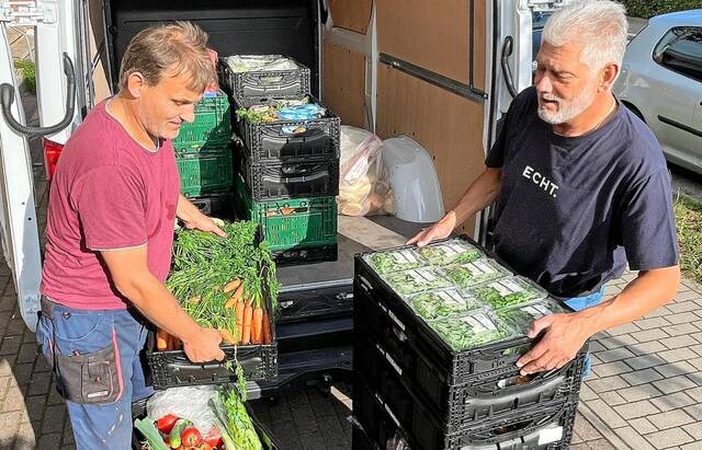 Drei Kisten Gemüse, eine Kiste Molkereiprodukte, eine große Packung Donuts, einen Sack mit Brötchen hat Christine Helmis, Mitarbeiterin eines Discounters, für die ehrenamtlichen Helfer der Tafel. Und ein fröhliches „bis morgen!“, mit dem sie die beiden verabschiedet.