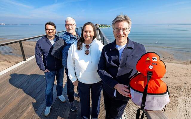 André Rosinski (v.re.), Vorstand der Tourismus-Agentur Lübecker Bucht (TALB), Seebrückenschwimmen-Schirmfrau Sandra Völker, Martin Lenz von der Agentur PALM-SPORTS und TALB-Veranstaltungsleiter Alexander Will auf der Seebrücke in Scharbeutz.Foto: Fotoagentur 54°|Felix König