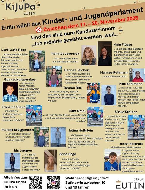 16 Kandidaten stehen dieses Jahr zur Wahl. Wählen können alle Kinder und Jugendlichen im Alter von 10 bis 19 Jahren mit Wohnsitz in Eutin. Gewählt wird an den Eutiner Schulen, erstmalig dieses Jahr auch an der KBS sowie im Jugendzentrum. Die genauen Wahltermine und Orte stehen noch nicht fest und werden bald bekanntgegeben.