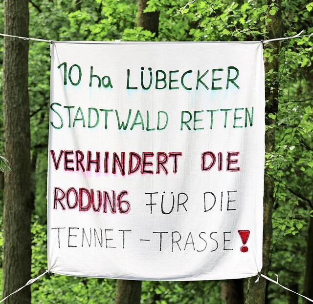 Die nördliche Umgehung war auch von Anfang die Forderung des Bündnisses „Lübecker Stadtwald retten“, zu dem sich etliche Initiativen zusammengeschlossen haben. Das Bündnis protestiert seit Monaten mit Transparenten, die im Wald aufgehängt sind, mit Waldspaziergängen, einer Menschenkette und Baumpflanzungen gegen die Tennet-Pläne.