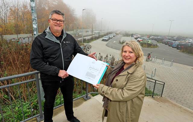 „Wir wollen, dass mehr Menschen bequem und sicher mit dem Rad zur Bahn kommen“, sagt Fiedel. Er hat jetzt den Förderbescheid des Landes Schleswig-Holstein an die Bausenatorin übergeben. „Mit der neuen Bike+Ride-Anlage in Lübeck-Moisling verbessern wir das Angebot für Radpendlerinnen und -pendler und leisten damit einen weiteren wichtigen Beitrag zur nachhaltigen Mobilität in unserer Stadt“, sagt Hagen. „Wir freuen uns, dass wir den Bahnhaltepunkt Moisling mit dieser Maßnahme weiter aufwerten können.“Etwa 1300 Ein- und Aussteiger nutzen den Bahnhaltepunkt Moisling am Tag. Bislang können Radler 56 nicht überdachte Stellplätze auf der Südseite und 36 Stellplätze auf der Nordseite nutzen. „Auf der Nordseite bleiben die bestehenden Stellplätze zunächst erhalten. In einem zweiten Schritt ist dort der Bau einer weiteren B+R-Anlage mit rund 100 Stellplätzen vorgesehen“, sagt Fiedler. „Damit sollen mittelfristig 210 Fahrradstellplätzen zur Verfügung stehen.“