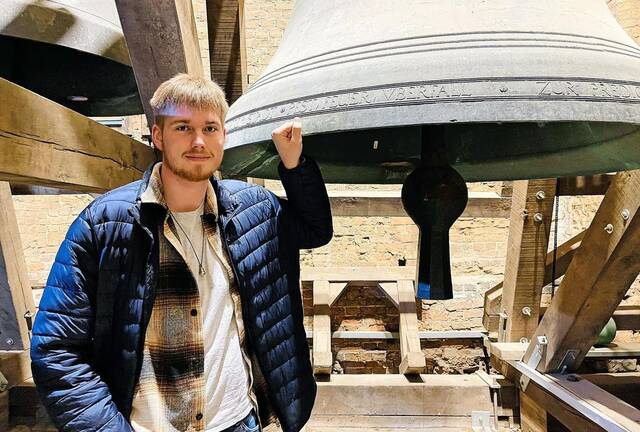 „Bisher sind es rund vierzig Videos“, berichtet Pagels. „Vor etwa drei Jahren habe ich jemanden kennengelernt, der Glockengeläute filmt und online stellt. Also bin ich selbst mit Kamera und Mikrofon losgezogen und habe unter anderem das Geläut von St. Marien aufgenommen.“ Dem großgewachsenen jungen Mann ist die Begeisterung deutlich anzumerken. Diese fiel auch Marienpastor Robert Pfeifer auf, der ihn mit Helmut Brauer, einem weiteren Glockeninteressierten an St. Marien, bekannt machte. Gemeinsam überlegen sie, wie die Glocken der Marienkirche am besten gemeinsam erklingen können. Insgesamt verfügt die St.-Marien-Kirche über zwölf Läuteglocken sowie 37 Glocken im Glockenspiel. „Meine Lieblingsglocke ist die Pulsglocke mit ihren 5,8 Tonnen“, sagt Pagels. „Sie war die erste Großglocke Deutschlands nach dem 2. Weltkrieg und ist bis heute die größte Glocke Schleswig-Holsteins.“ Im Jahr 2023 wurden zudem drei neue Glocken feierlich in das Hauptgeläut aufgenommen. Pagels war beim Guss persönlich vor Ort in der Glocken- und Kunstgießerei Rincker in Sinn dabei. „Das war eine tolle Erfahrung“, erinnert er sich.