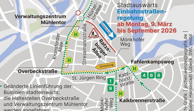 Die Linien 1 und 9 fahren ab der Haltestelle Kalkbrennerstraße über den Mönkhofer Weg, links in den St.-Jürgen-Ring und dann weiter in die Kronsforder Allee zum Mühlentorteller. Die umgeleiteten Linien stoppen an den Haltestellen Overbeckstraße und Verwaltungszentrum Mühlentor. Stadteinwärts halten die Busse wegen der Baustelle aktuell nicht an der Stresemannstraße. Für die Wasserkunst gibt es einen Ersatzhalt. Ob diese beiden Haltestellen wieder normal angefahren werden, wenn die Baustelle Ende Mai auf die andere Straßenseite zieht, befinde sich aktuell noch in der Abstimmung, sagt die Stadt.