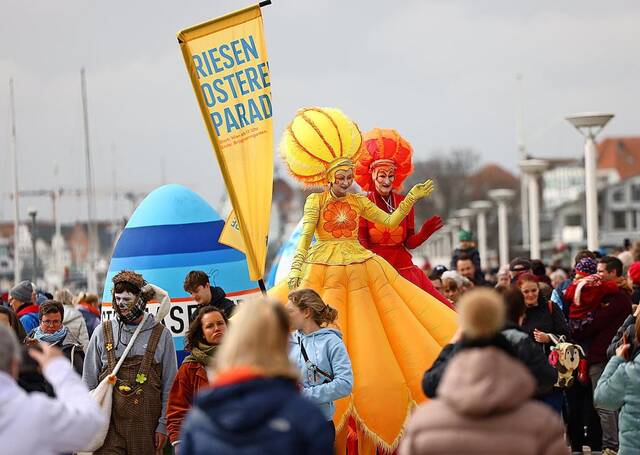 Der Ostersonntag steht ganz im Zeichen der großen Riesen-Osterei-Parade. Der Umzug startet um 13 Uhr am Kreuzfahrtterminal – angeführt von Lübecks Freibeutermukke, Walking Acts auf Stelzen und dem Osterhasen persönlich, der gratis Schokoladeneier verteilt. Ziel ist der Brügmanngarten, wo der Osterhase nach seiner Ankunft zum „Meet & Greet“ für die Kleinen einlädt. Der Hase wird gegen 14 Uhr erwartet und steht dann für ein Foto für das Familienalbum zur Verfügung. Er wird begleitet von einem Platzkonzert der Freibeutermukke.Für Kinder verwandelt sich der Brügmanngarten von Ostersamstag bis Ostermontag in ein aufregendes Spieleparadies mit Riesenrad, Hüpfburgen, der beliebten „Knatterbahn“, einer Kistenrutsche auf Rollen und vielen weiteren Spielmodulen. Gastronominnen und Gastronomen aus Travemünde und der Region bieten Crêpes, Eis, Kaffeespezialitäten, Muffins sowie Grill- und Fischspezialitäten, Flammkuchen und Snacks für die ganze Familie an.