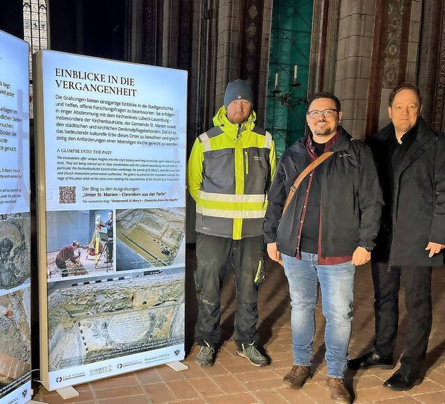 Lübeck. Seit Monaten erforschen Archäologen die tiefen Schichten unter dem Fußboden von St. Marien. Im Fokus stehen dabei die historischen Grüfte und deren Bedeutung als Bestattungsorte der Hanse-Eliten. Ganz neu: Über beleuchtete Infotafeln erfahren Besucherinnen und Besucher mehr über die Arbeiten des Archäologen-Teams. Freskenmalereien und Inschriften aus dem 17. Jahrhundert, Fundamentreste und Backsteinmauern: Mit Schaufeln und Besen legt das Team an mehreren Stellen im Kirchraum Fenster in die Vergangenheit frei; Einblicke in Jahrhunderte, in denen sich reiche Lübecker Kaufleute Grabstätten in der Kirche sicherten. Anlass für die Arbeiten sind die Vorbereitungsmaßnahmen zum Einbau einer neuen Fußbodenheizung. Über die Arbeit seines Teams informiert André Dubisch, Leiter der Innenstadtarchäologie bei der Hansestadt Lübeck, regelmäßig im Blog „Unter St. Marien – Chroniken aus der Tiefe“. „Für die Lübecker Archäologie ist es eine ganz besondere Grabung. St. Marien ist die Kirche der Hanse-Kaufleute und wir erfahren hier viel über ihre Bestattungen. So schnell wird man nicht wieder so nah drankommen“, heißt es dort. „Die Funde eröffnen ganze Welten der Vergangenheit“, sagt auch Marienpastor Robert Pfeifer. „Sie machen sichtbar, wie Menschen über Jahrhunderte hinweg Kirche als Ort der Hoffnung und der Geborgenheit verstanden haben. Hier wird deutlich, wie eng kirchliches Leben und städtische Entwicklung miteinander verwoben sind.“