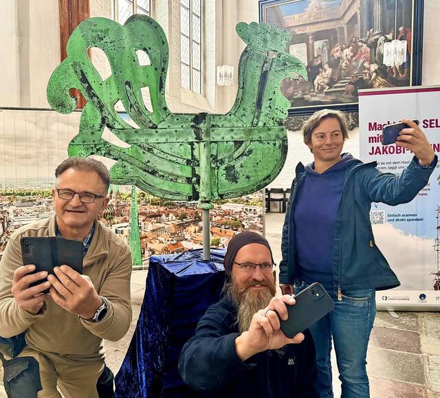 Diesen Wunsch erfüllt St. Jakobi nun offiziell: Der Wetterhahn ist jetzt in der Kirche ausgestellt – mit einem eigens gestalteten Fotospot, inklusive Luftaufnahme der Turmspitze. „So können die Menschen nicht nur ein Selfie machen, sondern auch die historischen Inschriften bestaunen, die man sonst nie zu Gesicht bekommt“, erklärt Reichelt. Für Besucher ist das eine einmalige Gelegenheit, dem Hahn so unmittelbar zu begegnen – bevor er 2026 nach der Sanierung wieder an seinen angestammten Platz in luftiger Höhe zurückkehrt.