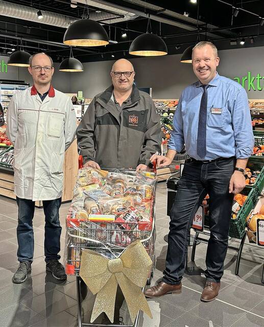 Auf dem Übergabefoto sind neben dem Gewinner auch der stellvertretende Warenhausleiter Jens Ziese sowie der Warenhausleiter Thomas Lasrich abgebildet.