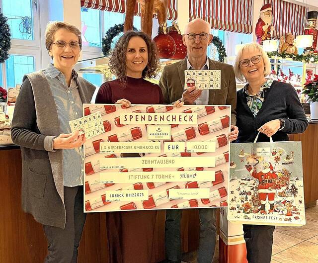 Die Mitglieder des 7-Türme-Stiftungsvorstandes, Annegret Röther, Heike Schumacher und Dr. Jan-Dirk Verwey, nahmen den symbolischen Spendenscheck von Mehrens-Strait entgegen. „Was für eine wundervolle Aktion und was für ein starkes Ergebnis“, sagt der Vorstandsvorsitzende Jan-Dirk Verwey. „Wir danken dem Lübecker Familienunternehmen Niederegger sehr herzlich für die beeindruckende Spendensumme. Damit stehen das Unternehmen und insbesondere die handelnden Personen ganz in der Tradition der ehrwürdigen Hanse-Kaufleute, die immer wieder und über Jahrhunderte dafür gesorgt haben, dass die prächtigen Kirchenbauten auf der Altstadtinsel erhalten werden konnten. Marzipan und die Sieben Turme sind eine gelungene Verbindung eingegangen. Der Erlös wird für die anstehenden dringenden Sanierungsarbeiten an den Kirchen eingesetzt.“ mho